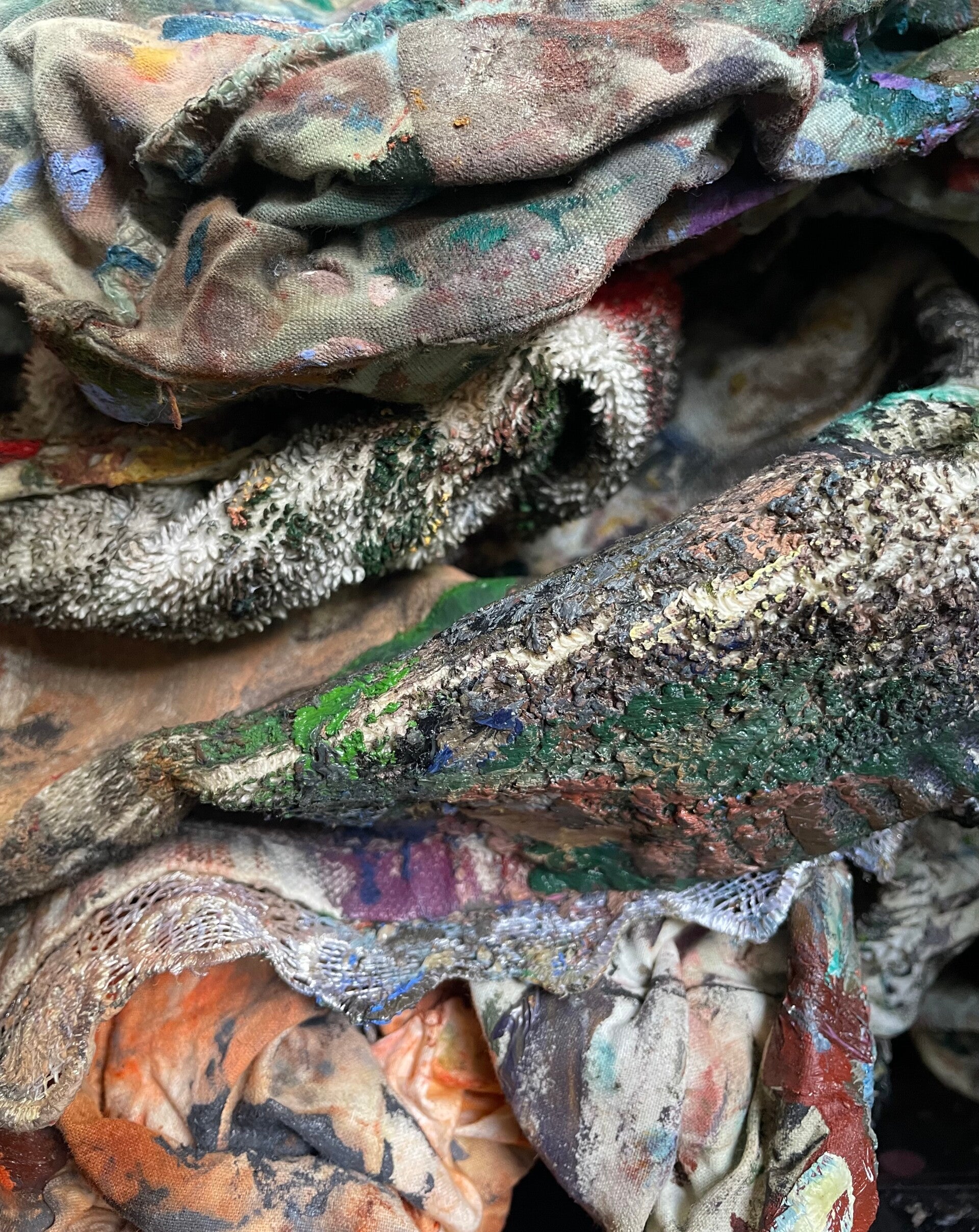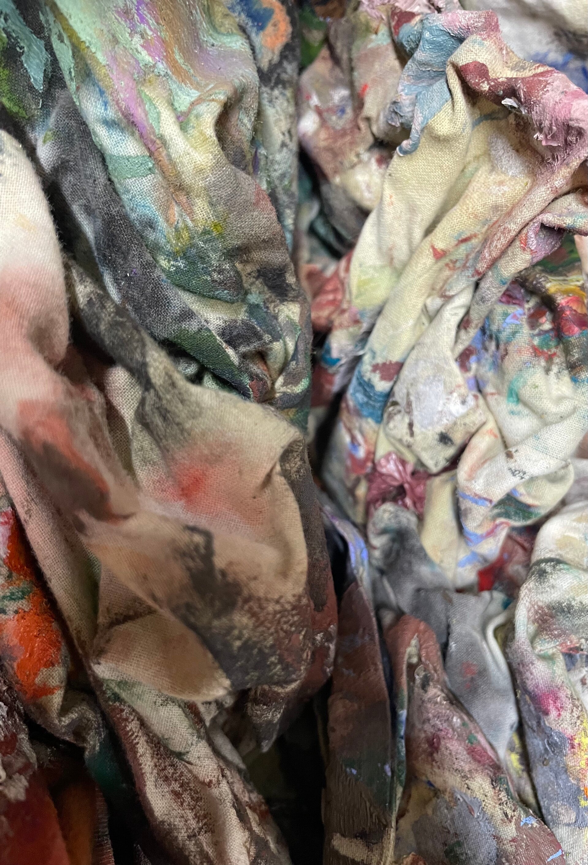 Old cloths, once woven into domestic life, return in the studio as rags, objects of utility conscripted for the most menial of tasks. Yet repetition transforms them. Pigment stiffens their fibres, gestures sediment within them, and time reshapes their form. What was once soft and forgettable acquires density, becoming an object that insists on being seen. No longer mere tools, these rags become unintended archives, repositories of maintenance, care, and labour without which artistic work could not exist.