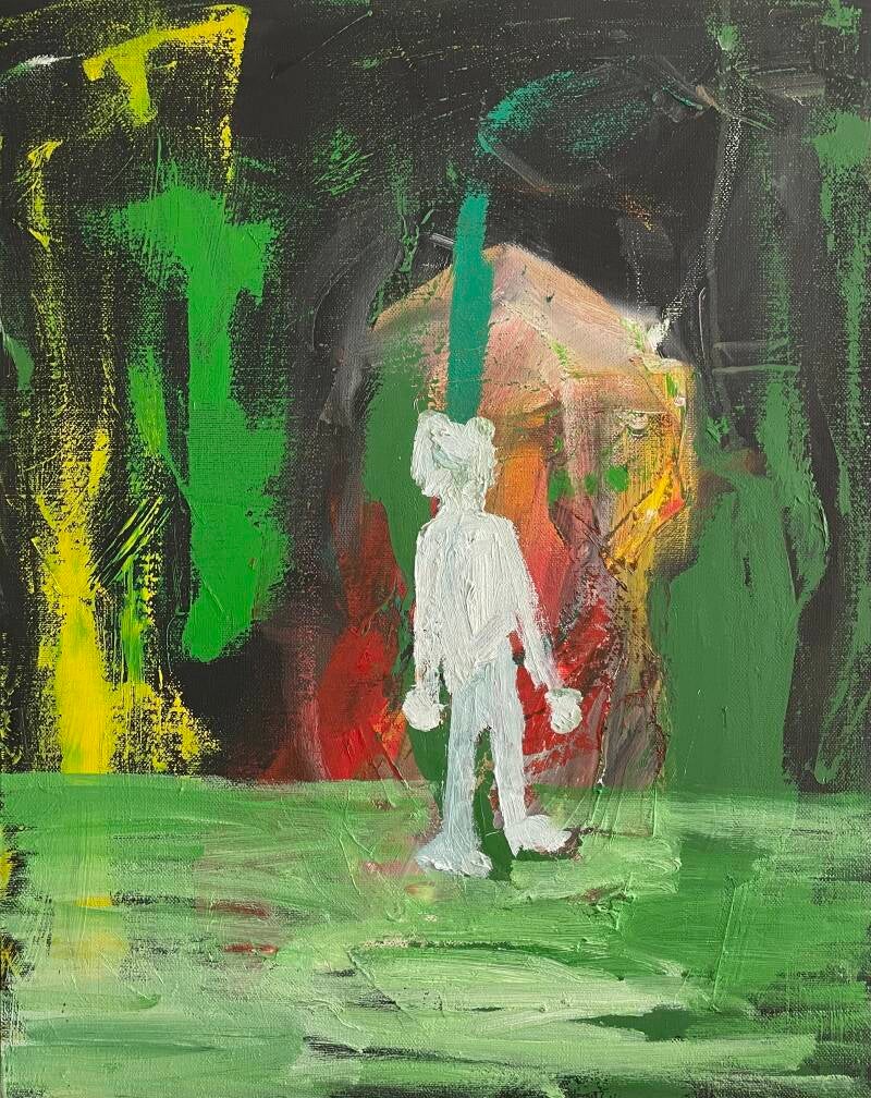 This is an ongoing body of work I keep returning to. Solitary figures stand in uncertain spaces, their features withheld. I paint them on inherited canvases, so they carry traces of what came before — presences shaped as much by absence as by what is shown. Narratives hover but are never fixed; meaning stays open, offered rather than imposed